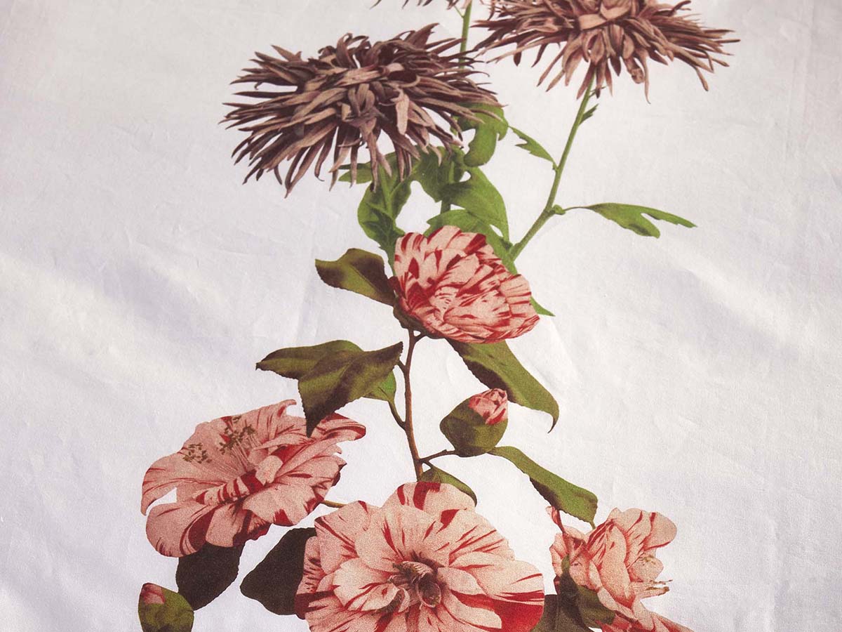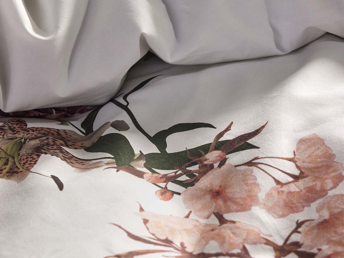 Een romantisch luchtige bloemenprint op rustgevende uni achtergrond. In de Dorena vind je verschillende bloemen zoals een gestreepte camelia, lelies, Japanse pioenroos, kersenbloesem, Japanse iris, chrysant en lotusbloem. Deze bloemen zijn afkomstig uit het Rijksmuseum. Het zijn ingekleurde foto’s gemaakt door de Japanse fotograaf Kazumasa Ogawa, rond 1890. Door de verschillende bloemen onder elkaar en in banen te plaatsen krijgt het geheel een moderne twist. Sla het dekbedovertrek om het geheel te balanceren met een rustgevende uni in dezelfde kleur.