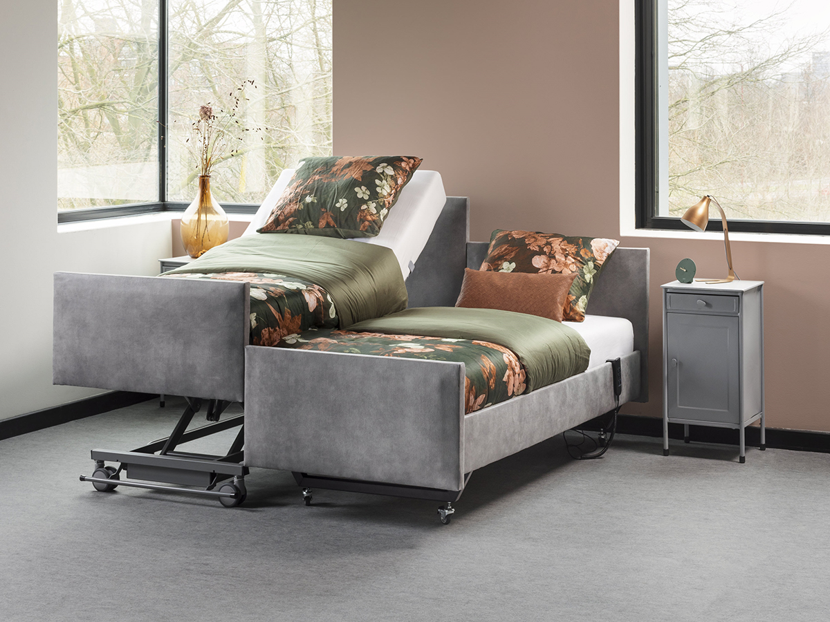 Hoogwaardig gestoffeerd zorgbed met veel verstelmogelijkheden
