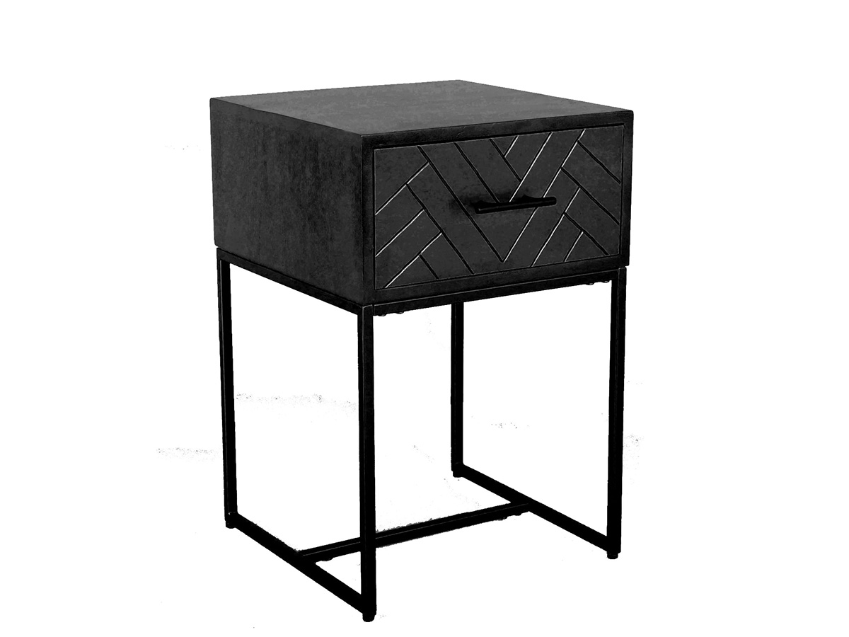 Het Jailey nachtkastje is gemaakt van zwart hout, met een visgraatmotief op de lade en een soft-close systeem voor extra gebruiksgemak.