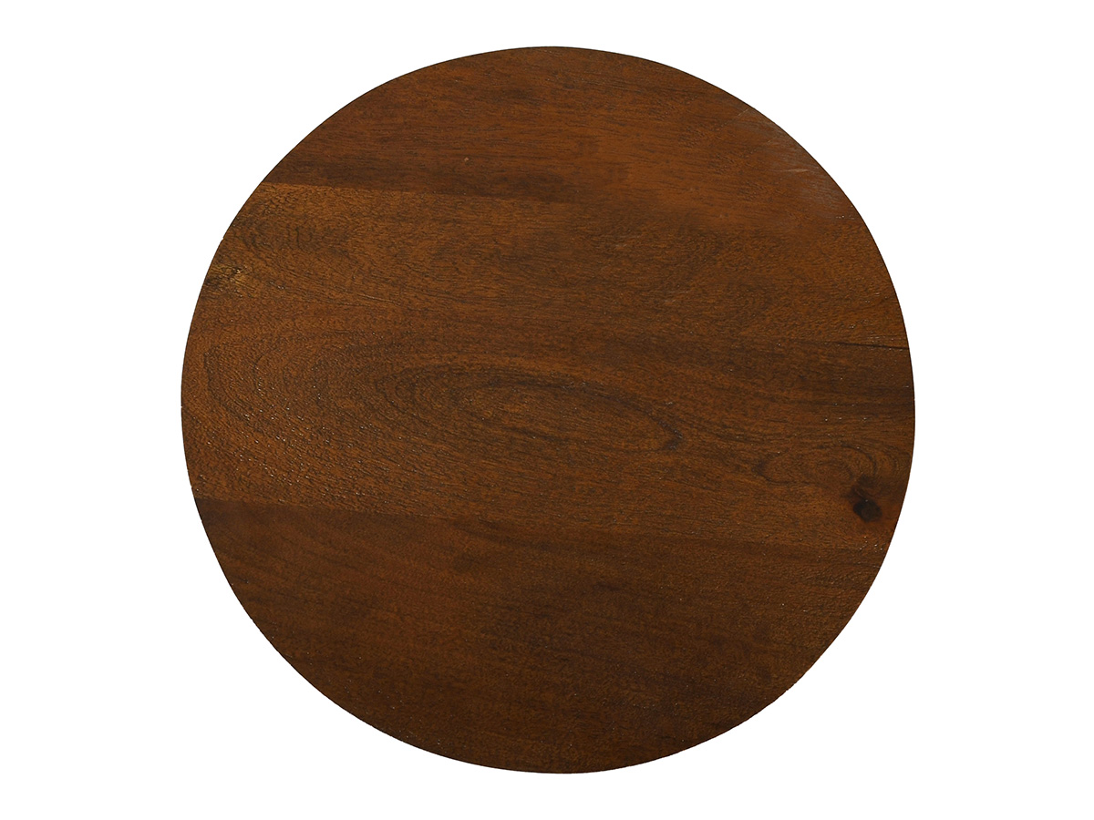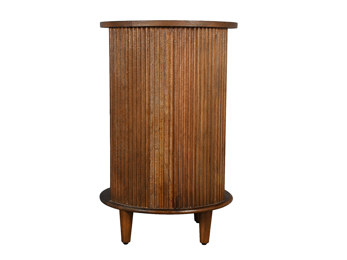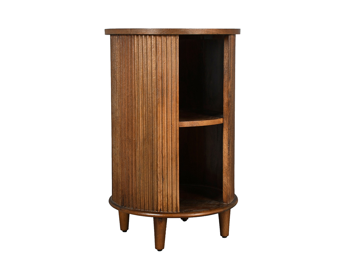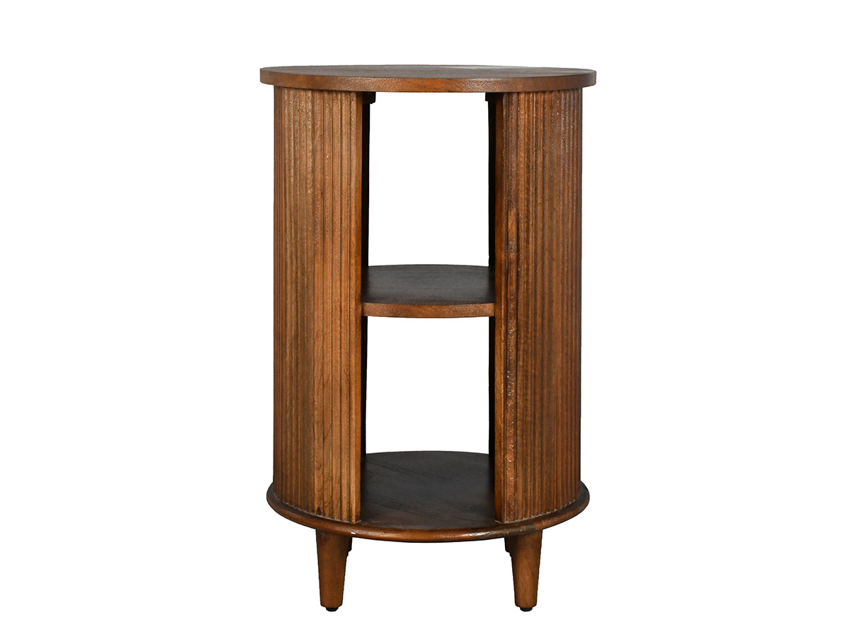 Het nachtkastje Olivia is gemaakt van mangohout met een donkere afwerking. Dit ronde nachtkastje is rondom bekleed met latjes. In het midden bevinden zich twee vakken.