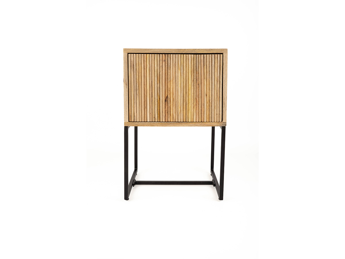 Het nachtkastje Sam, gemaakt van mangohout, heeft een front met latjes en een lade met touchsysteem.