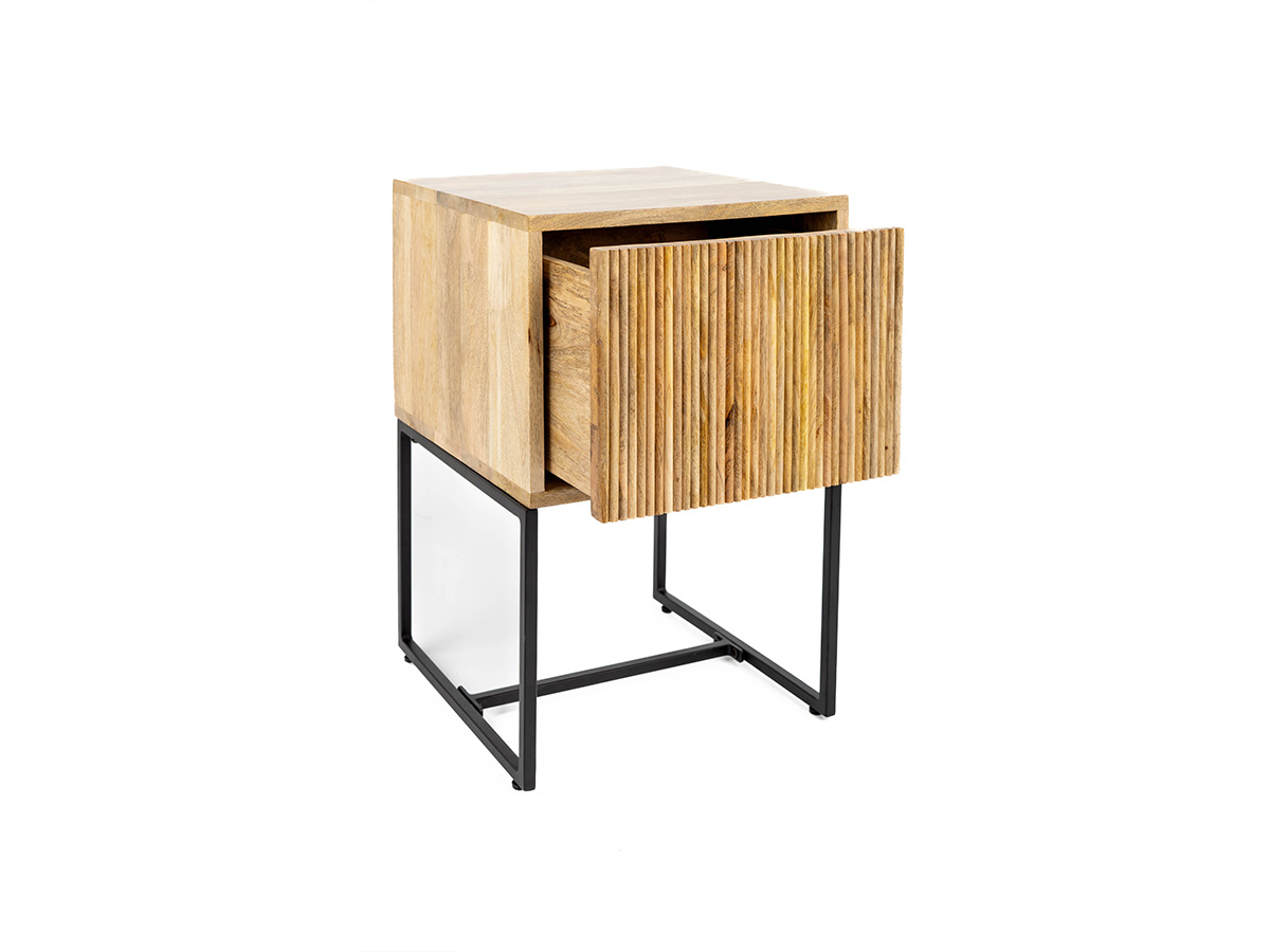 Het nachtkastje Sam is gemaakt van mangohout en is voorzien van een geribbeld detail aan de voorkant. Dit nachtkastje beschikt over een lade die opent met een touchsysteem.