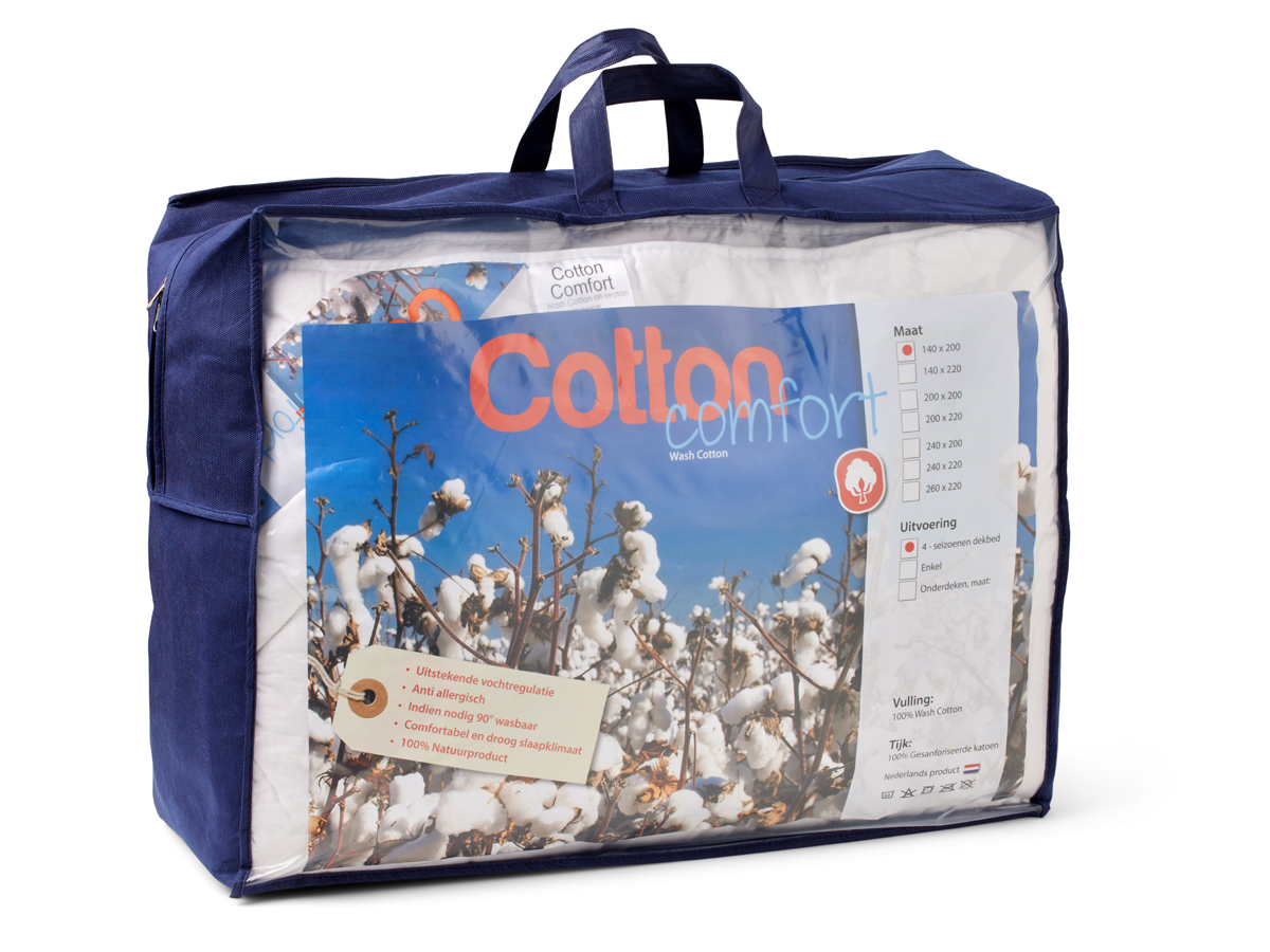 Het Wash Cotton dekbed is gevuld met 100% wash cotton. Het Dekbed bestaat uit twee delen en is eenvoudig aan elkaar te maken met drukkers. Het dekbed is door het hele jaar te gebruiken. De tijk is gemaakt van 100% gesanforiseerde katoen. Het dekbed is wasbaar op 60 graden.
